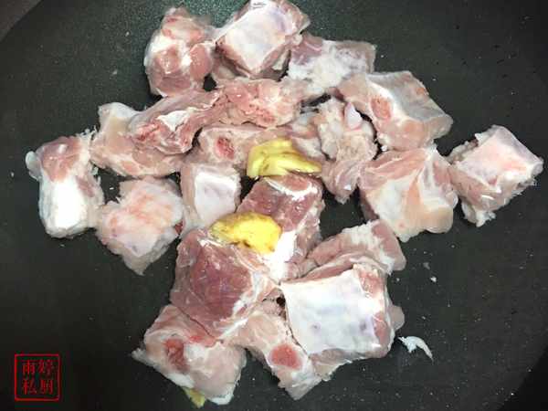 排骨洗凈血水,放入鍋中加入清水,加幾片生薑煮至沸騰後,持續5分鐘左右就關火,撈出排骨沖溫水洗凈瀝幹。