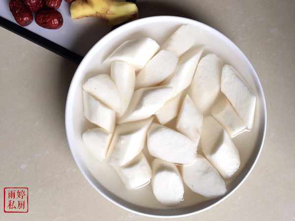 山藥削去表皮,切成塊狀,放入清水中浸泡,避免其氧化變黑。
