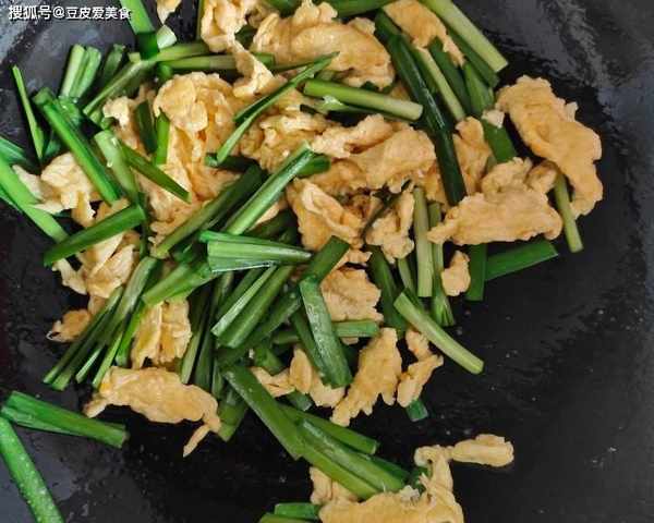 3、等雞蛋差不多成形後,下入韭菜後半部分,翻炒片刻,再下入韭菜葉子部分,繼續翻炒片刻,下入鹽調味,翻炒均勻,出鍋,完成。