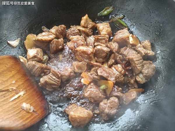 4、下入料酒,生抽,白砂糖,老抽,翻炒均勻,再下入足夠的熱水,沒過牛肉,大火燒開轉小火,慢慢燉煮40分鐘以上,至牛肉燉至軟爛後,下入土豆,繼續燉煮15分鐘左右,至土豆完全熟透,轉大火收汁,出鍋,完成。