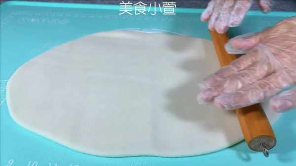 4.接下來放在案板上繼續揉,給它揉圓,再撒上點幹糯米粉,這樣面團表面會更加細膩光滑,揉好以後給它團圓,再給它按扁一些,再用搟面杖搟成成厚一點的大面片