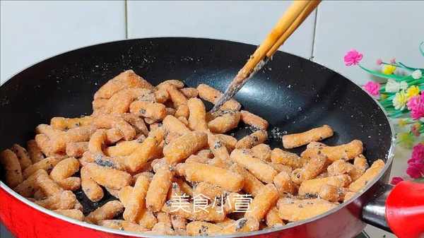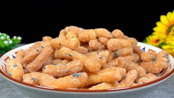 9.再加入一些黑芝麻,繼續攪拌,直到把黑芝麻裹均勻就可以。用筷子不停攪拌,這樣可以使江米條快速冷卻,慢慢就會看到掛上瞭一層白霜,這樣就可以瞭,香甜酥脆的江米條就做好瞭!