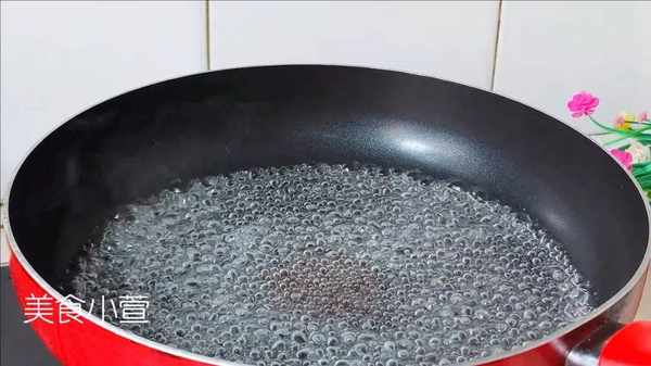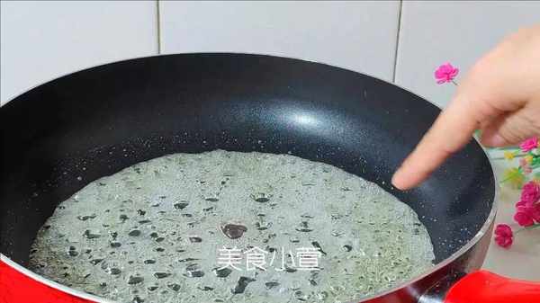 1.先把白糖倒入一個平底鍋裡面,沒有平底鍋的用普通鍋也可以,不要用帶紋路的鍋,裡面平滑一些最好,鍋裡面加入我們準備好的那碗清澈的黃河水,開中火,用鏟子來回滑動,讓白糖加速融化,白糖融化以後會看到水面泛起密集的小泡泡就可以
