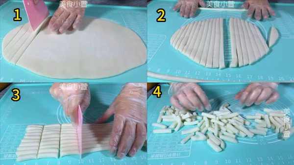 5.上面再撒點糯米粉,用手劃拉均勻,防止粘連,再用切面刀切成均等長條,寬度要盡量保持一致就可以,再搓粗細均等的圓形長條,比筷子粗一些就行,都搓完之後,一根根的並排擺放整齊,再用切面刀切成3厘米左右的長條,切好以後,撒點糯米粉給它抖撒。
