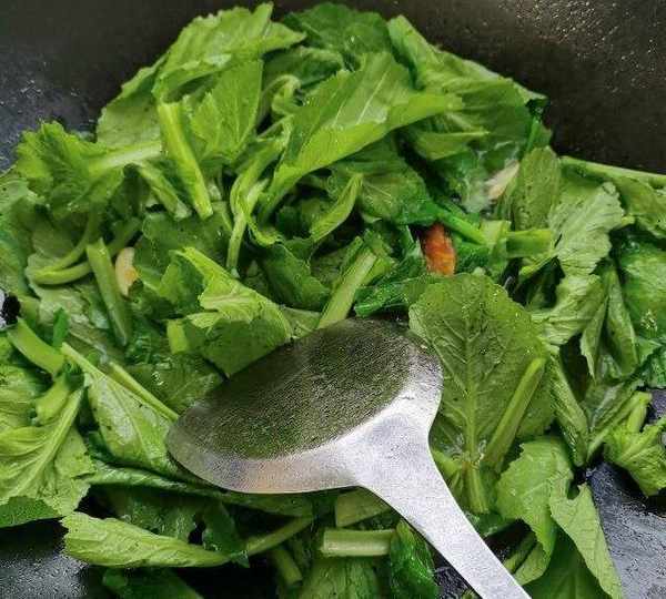 第7步、放入油渣翻一翻,加點鹽調味。再煮一煮,最好把芥菜煮出味。