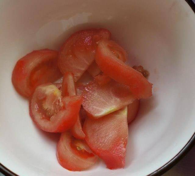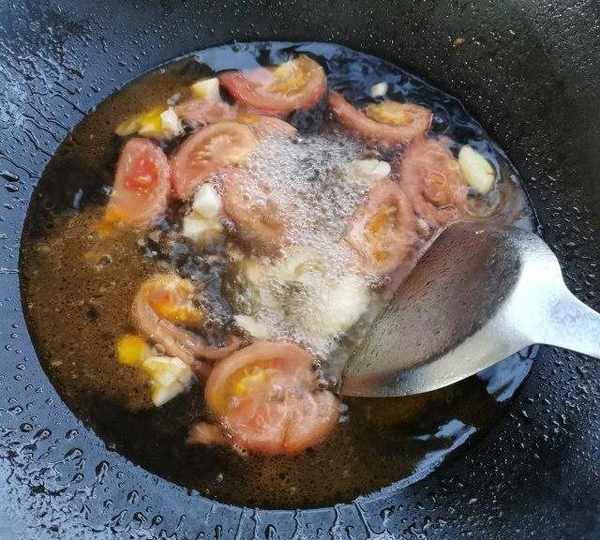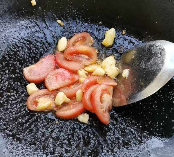 第3步、熱鍋下油,放入番茄蒜炒香。蒜是備來炒的,既然用不上就放瞭吧。