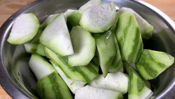 首先準備兩根絲瓜刮去外皮,再切成滾刀塊。