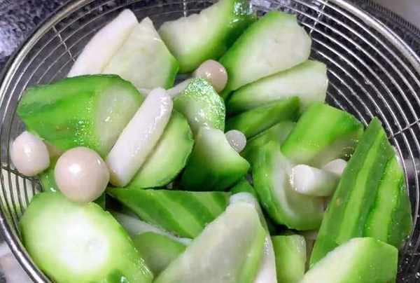 鍋中水燒開,加入少許鹽,少許食用油,先把海鮮菇放進鍋中焯水30秒,之後再放入絲瓜繼續焯水30秒,時間到瞭,控水撈出來備用。