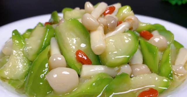 炒鍋中油熱之後,放入小料炒出香味。再把絲瓜、海鮮菇加進來快速的翻炒幾下,再倒入料汁翻炒均勻,最後出鍋前放入幾粒枸杞,翻炒均勻出鍋,一道非常好吃絲瓜炒海鮮菇就做好瞭。