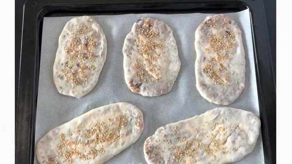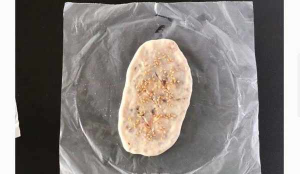 4.收口向下放,搟面杖抹油,輕輕地將餅搟薄,肉餡若隱若現,表面用刀劃幾下,撒白芝麻,輕輕按實。
