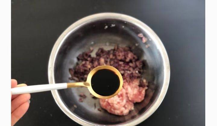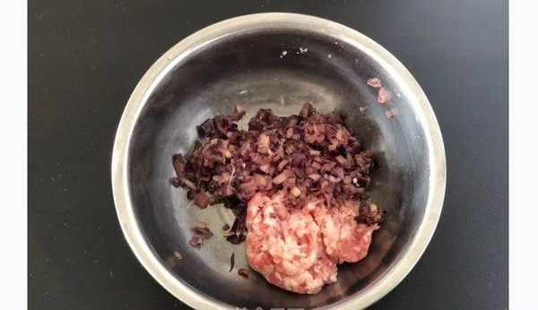 1.先來調餡兒,豬肉剁成肉沫,洋蔥提前用鹽醃制半小時,抓幹水分後剁碎,放入肉餡兒中。