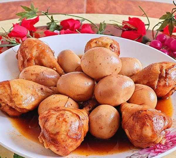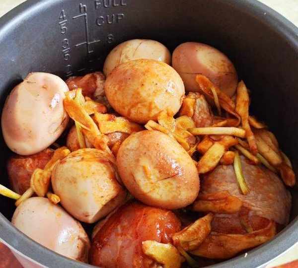 第5步、擺入醃好的雞腿以及剝去殼的雞蛋,倒入醃料汁,按煮飯鍵即可。