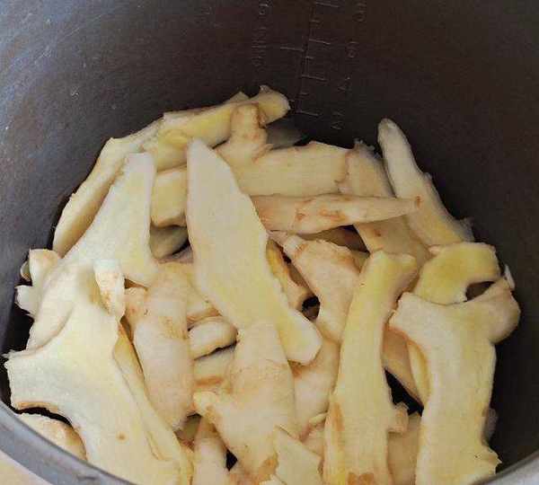 第4步、電飯鍋底鋪一層薑片、蔥段。