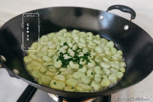 第二步,炒蠶豆。接著,準備好一把香蔥,清洗幹凈後切成蔥花備用。鍋中加入食用油,油熱後,倒入洗凈的蠶豆,翻炒均勻。