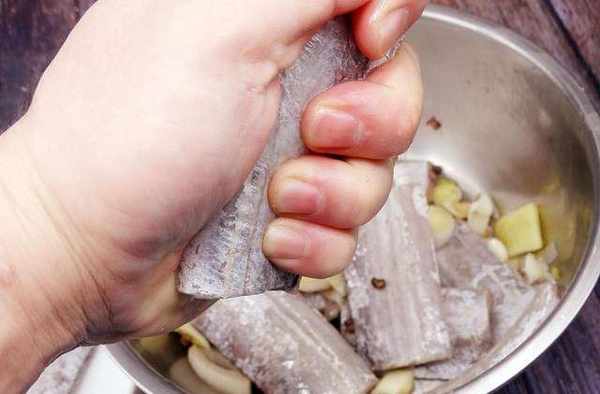今天用這些帶魚做一個焦香四溢的香煎帶魚,首先把帶魚清洗幹凈,度中的內臟和黑膜要清除幹凈,清洗完成後準備大通切斷,生槍一塊切片,切好一同放入碗中,碗中再加入兩塊食鹽,加入一克胡椒粉,加入5克料酒,用手抓拌均勻後醃制15分鐘,把帶魚醃制入味,並且曲星15分鐘後把醃好的帶魚挑出備用,接著在一個碗中打瞭一個雞蛋,用筷子把雞蛋液充分攪散,再準備15克淀粉倒入到一個盤中,盤中再加入15克面粉,面粉和淀粉的比例是1:1,把面粉攪拌均勻。