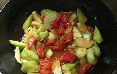 熱鍋涼油,下入薑絲跟蔥白煸炒出香味後下入番茄。炒出汁水後加入絲瓜。翻炒至絲瓜略軟塌。