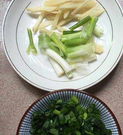準備配菜將絲瓜去皮切滾刀塊。然後將生薑切絲、蔥白切段、蔥葉切細末。