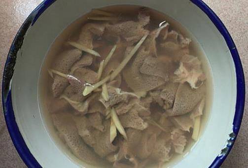 先將主要食材豬肝準備好,一定要在流動的水下沖洗幹凈後用料酒水浸泡30分鐘。然後將浸泡好的豬肝切成薄片。