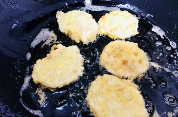 5.鐵鍋燒熱,倒入適量花生油,中火把油燒熱,待花生油7成熱的時候,把藕合掛糊上漿,輕輕放入油鍋中,一面炸好定型之後,立即翻面,炸另外一面。等藕合基本熟透,可以稍調大火,快速把藕合炸成金黃色,就可以撈出瞭。