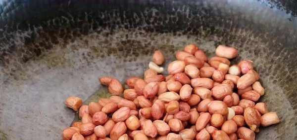 5、然後把控幹水分的花生米倒入鍋中。花生米進鍋之後,咱們就可以開火瞭,打開小火慢炒,用鏟子不停地翻動,讓花生米受熱均勻。就這樣一直不停地慢慢炒,大概炒四分鐘左右。然後咱們把火關掉,再加上一瓶蓋左右的白酒,最好用高度白酒。