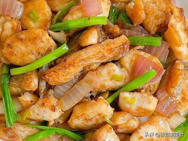 4、鍋中底油,放入洋蔥、薑片、蒜片炒出香味,再放入煎過的鱸魚翻炒均勻。接著放入醬汁燜煮一會兒。