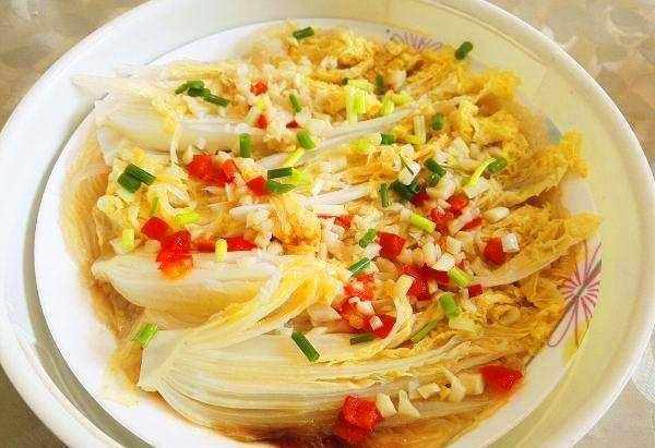 1.大白菜瀝幹水分,整株切塊,放入盤中蒸6-8分鐘至熟透。