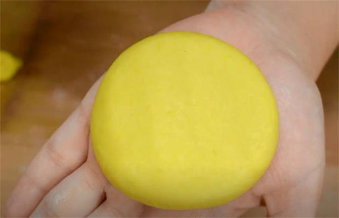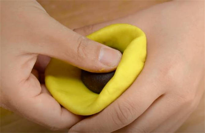 5.把面劑揉勻,放在掌心更容易一些,按扁,直接捏成一個小圓餅,中間包一顆豆沙餡,然後利用虎口處這樣邊往下按,邊往裡收。