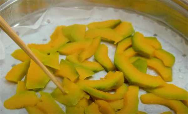 1.這是昨天買的小南瓜,切成薄片,把南瓜蒸熟,蒸瞭有15分鐘已經蒸好瞭,取出來。