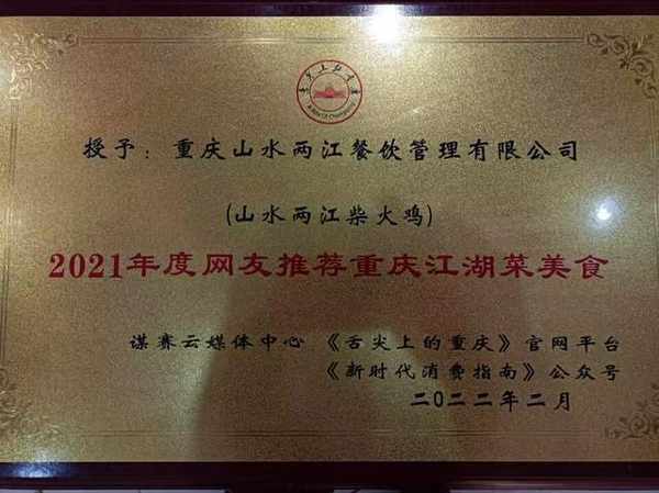 山水兩江柴火雞榮獲“特色民間美食店、金牌民間菜、五星金牌菜、中國名菜”等稱號。2022年2月,又被《舌尖上的重慶》官網授予“2021年度網友推薦重慶江湖菜美食”榮譽稱號。2023年,“山水兩江”柴火雞制作技藝,被渝北區文旅委授予“渝北區非物質文化遺產”稱號。