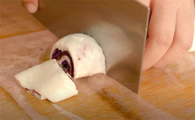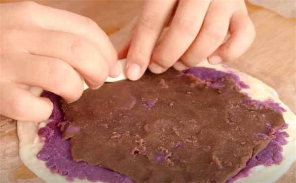 4.我買的這個紫薯不太甜,又放瞭一些紅豆沙,同樣把這個豆沙也鋪平,然後卷起來。