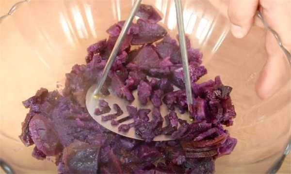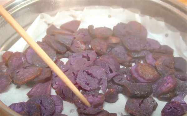 1.把紫薯削皮,切成薄片,再把紫薯鋪平,水開之後蒸15分鐘,現在這個紫薯已經蒸好瞭,把它取出來。