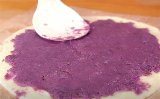 3.再準備一張現成的手抓餅,把這個外皮去掉,上面先覆蓋一層紫薯泥,像這樣鋪平就可以瞭。