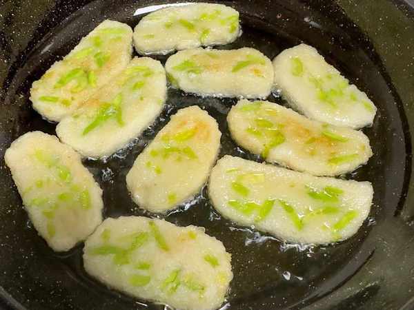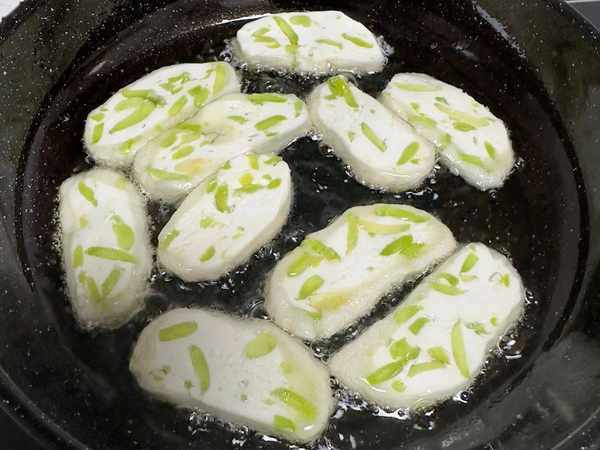 [3] 平底鍋中倒入適量油,將切好片的糯米片放入鍋中,小火煎至兩面微微焦黃即可出鍋 (如果切得薄,很快就會熟透,如果切得厚,多煎一會)。