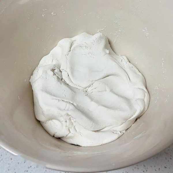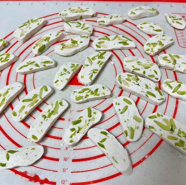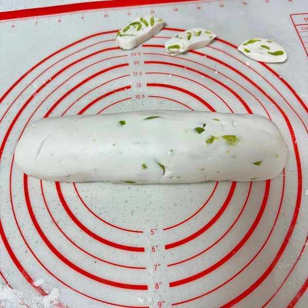 [2] 糯米粉加熱水和成光滑的面團,加入蠶豆瓣,混合均勻,揉成棒槌狀,用刀切成片,薄厚按自己喜好即可。