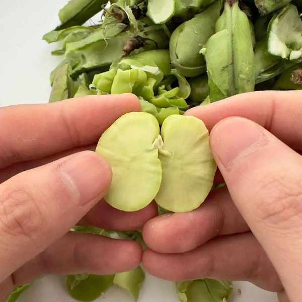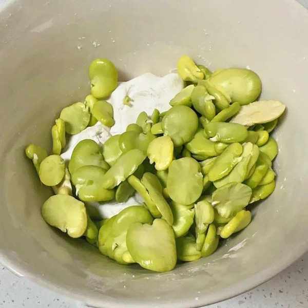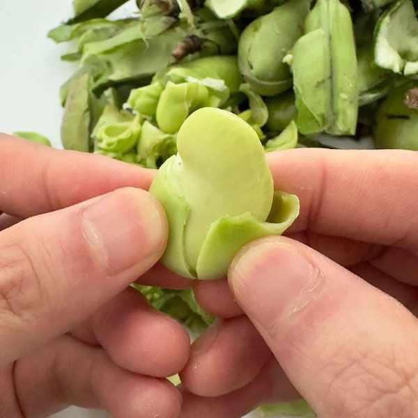 [1] 買回來的新鮮蠶豆剝去外殼,然後再剝去表皮,掰成兩瓣,放一旁備用。