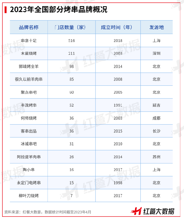 即使有木屋燒烤、很久之前羊肉串、豐茂烤串、聚點串吧、冰城串吧等小有成績的燒烤連鎖品牌,大多數燒烤店依然以城市或區域為單位盤踞,連鎖門店數量超過50傢的寥寥無幾。