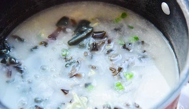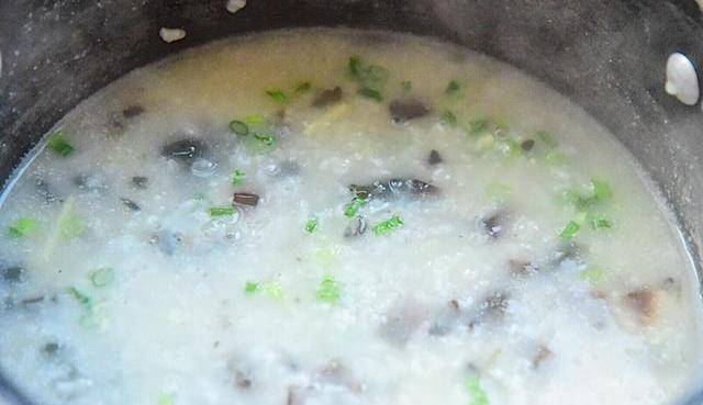 4、轉中小火繼續煮5分鐘,最後加入鹽、芝麻油、白胡椒粉、雞粉調味,出鍋前撒上蔥花即可搞定瞭一碗軟糯入味的海參皮蛋粥啦。