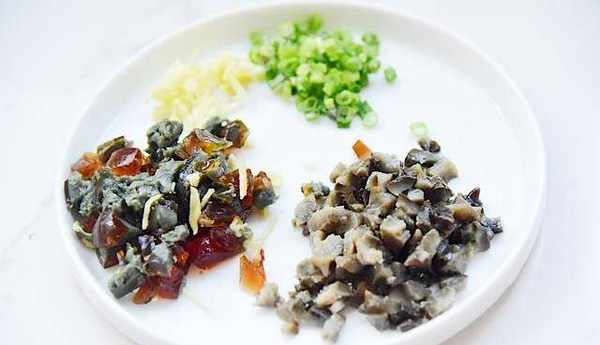 2、把海參切丁、皮蛋切丁、薑切絲、香蔥切碎備用。