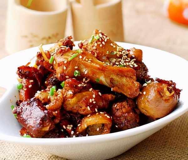 9.上桌,隻放雞塊,其他材料丟掉,撒上切碎的香蔥和煮熟的芝麻。