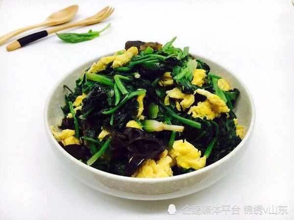 ③另起鍋加油,燒熱後倒入蛋液,炒成小塊,再倒入菠菜,木耳翻炒均勻。