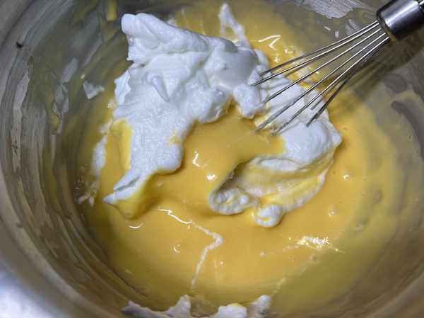 8,先取三分之一的蛋白霜,加入蛋黃糊裡,用刮刀或者蛋抽上下翻拌均勻,動作要輕且快,不要胡亂攪一通。