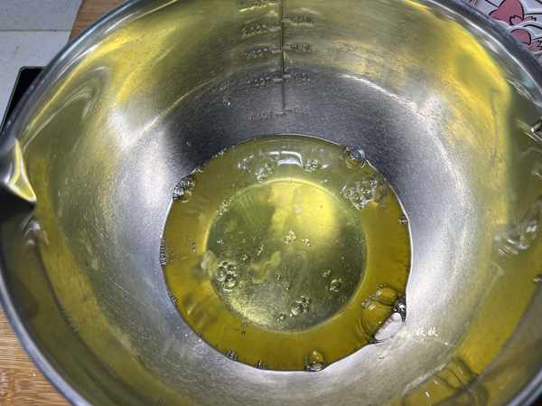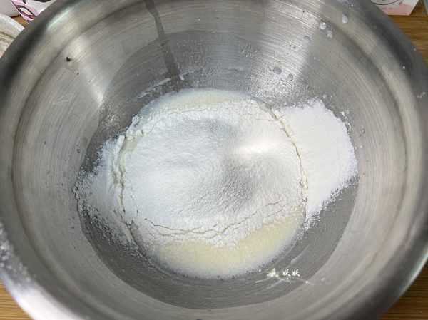 1,準備一個幹凈的容器,倒入玉米油和純牛奶,用蛋抽充分攪打至乳化狀態。