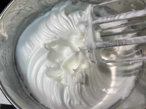 7,打蛋清的時候,把白砂糖分三次加入到蛋白裡,打蛋器先低速再中高速,然後再用低速打至細膩潔白的狀態,打好的蛋白霜如奶油一般細膩,提起打蛋頭,能拉出直立的小尖角。