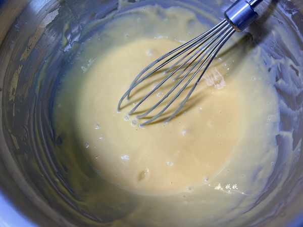 6,用蛋抽把蛋黃糊混合均勻,靜置在一旁,就可以開始打蛋清瞭,這時可以預熱烤箱。