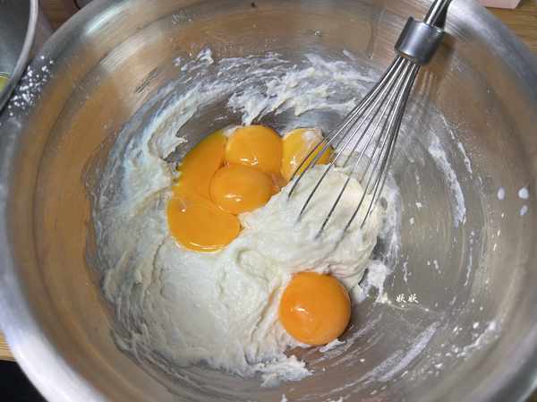 4,雞蛋提前在冰箱裡冷藏四個小時以上,然後把蛋清和蛋黃分離,蛋黃放到面糊裡,蛋清磕入一個幹凈的無水無油的打蛋盆裡。