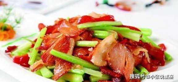 3、加入芹菜翻炒,不斷翻炒,直到芹菜變色,加少許鹽調味,培根會更咸,所以少放鹽,最後加入芹菜葉,拌勻後出鍋。
