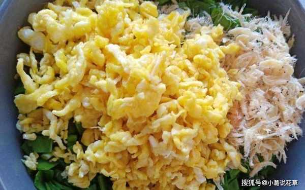 第四步:準備一個大碗,放入韭菜、雞蛋和蝦殼,撒上適量的鹽、雞精和食用油拌勻成餡。