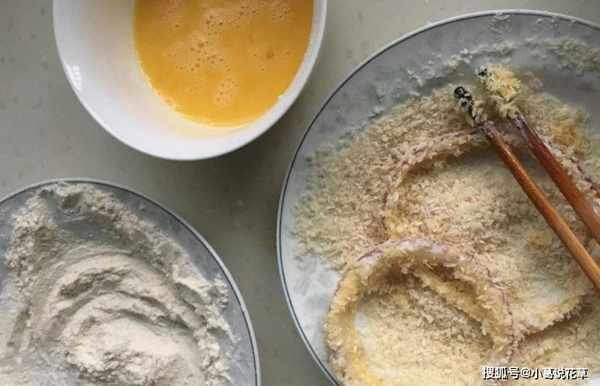第六步:鍋中再倒入少許油,燒熱,放入裹著面包片的洋蔥圈,中火炸至金黃色,撈出即可食用。