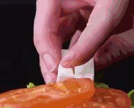 攝影師先用牙簽把蔬菜和西紅柿固定好,露出新鮮的一面,然後放上三角棉花,再放上面包,三角形多汁的漢堡就出來瞭,要好看。這就是我們在廣告中看到的漢堡包。
