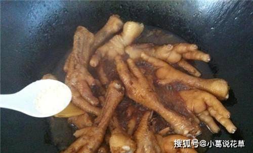 第三步:雞爪撈出後,可以先用冷水沖洗一下雞爪,然後熱鍋放油,放入薑蒜,然後倒入瀝幹水分的雞爪開始翻炒。一會兒倒入紅糖和白酒。稍微攪拌後,倒入步驟2的醬汁。快速攪拌後,加水覆蓋。水在高溫下沸騰後,蓋上蓋子,用中火燉。煮30分鐘。待鍋內汁收幹時,倒入雞粉,拌勻關火。